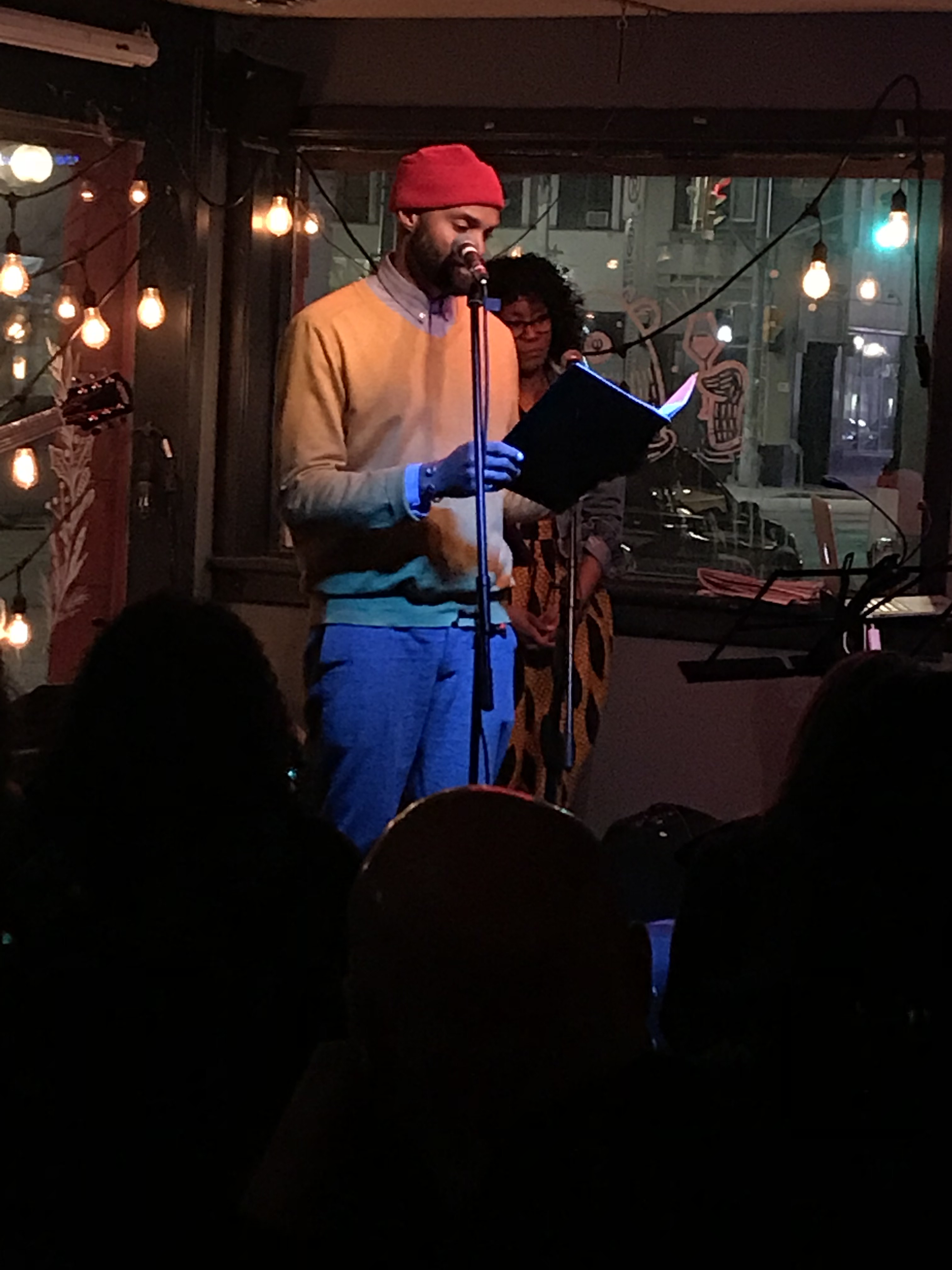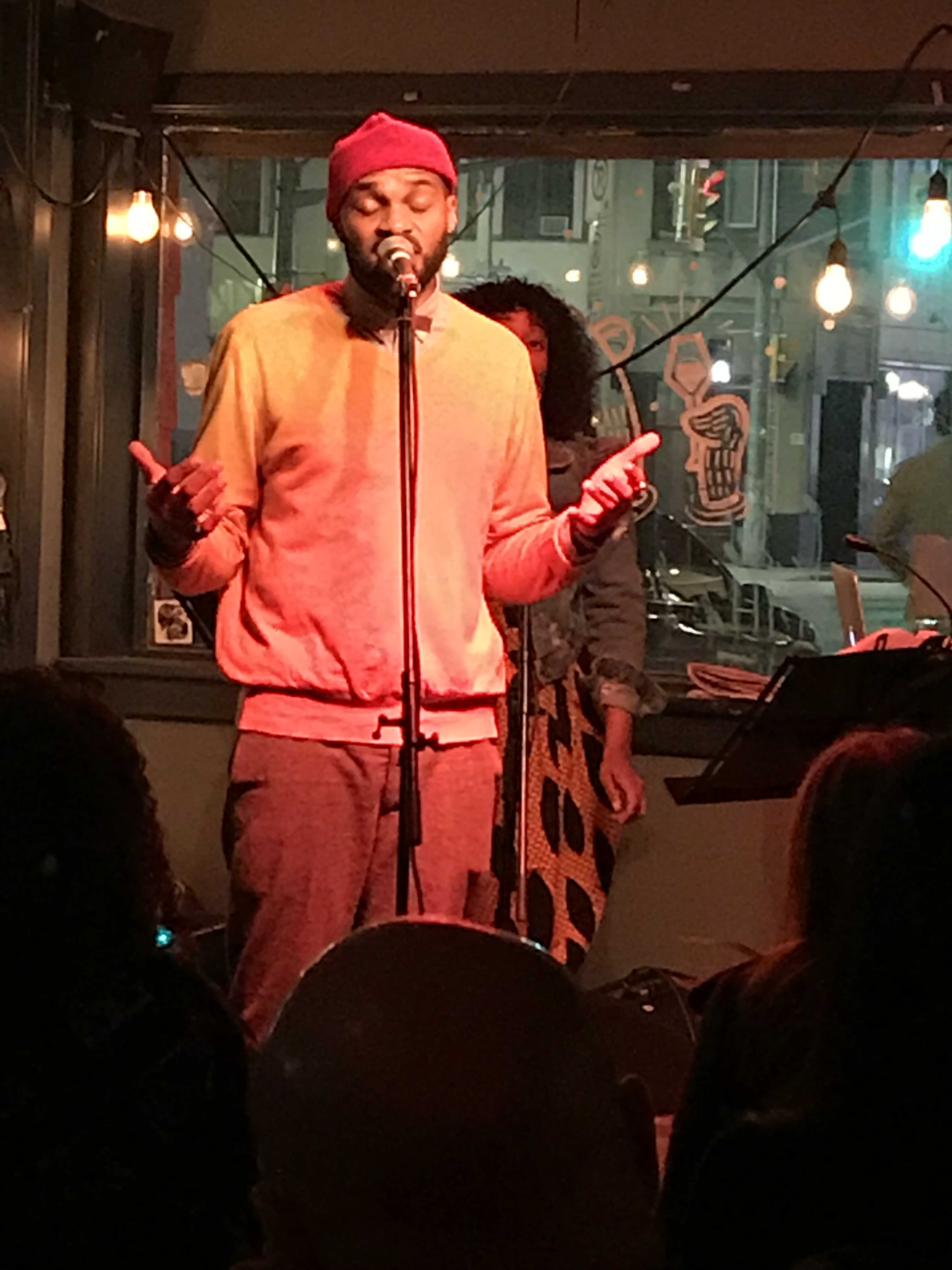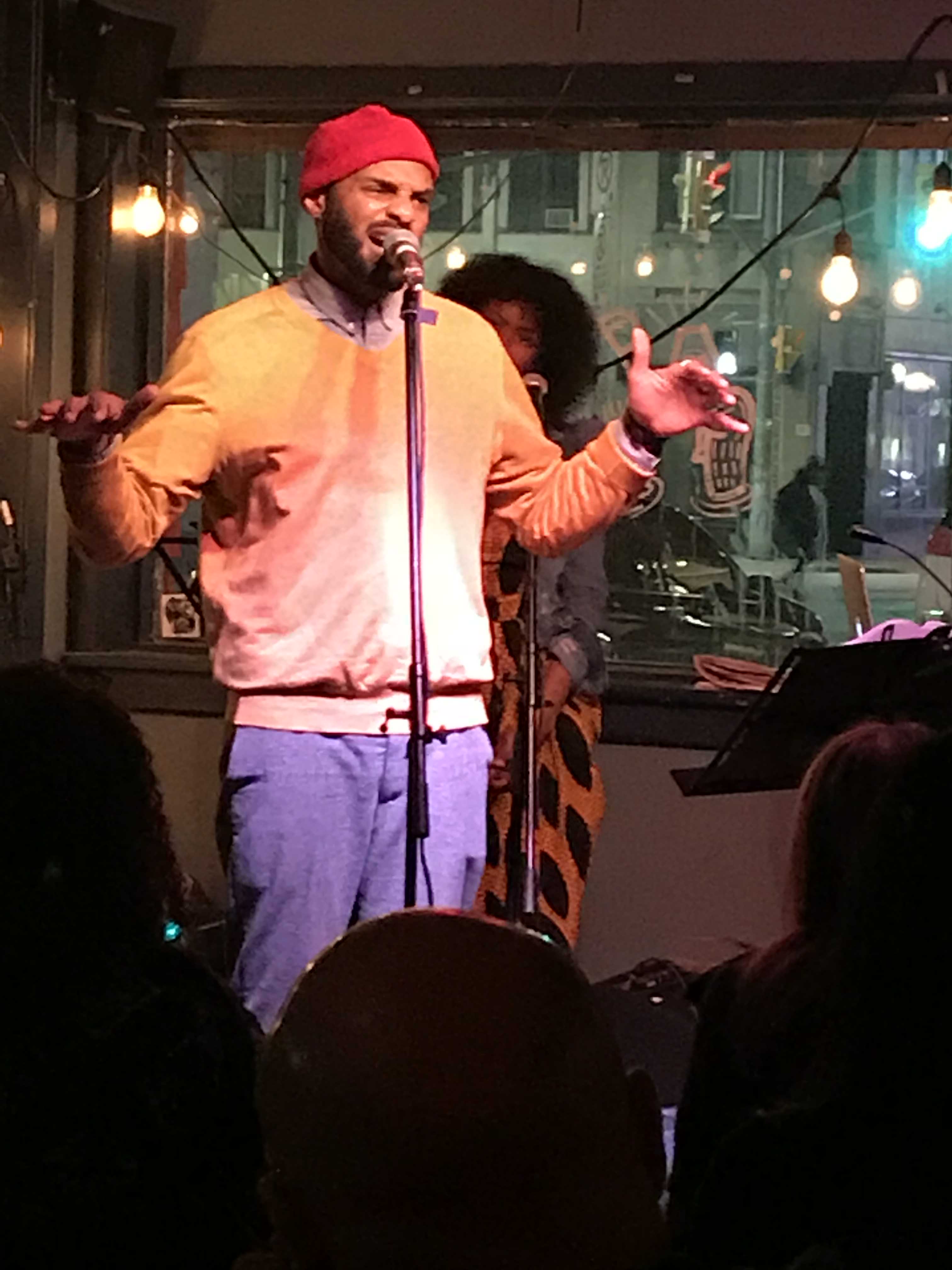 In a small rustic place with dimmed lights, and stringed outdoor lights to illuminate a small stage, a man’s voice was heard coming from the back of the room. Making his way through the audience up to the stage wearing a red beanie and a mustard color sweater, Khari McClelland, with nothing more than just his powerful tenor vocals, began to sing what sounded like a traditional slave song. Repeating the phrase “we are in this boat together,” Khari sang around the audience including every single person into his performance. The feeling that I was hoping to find finally resonated within.